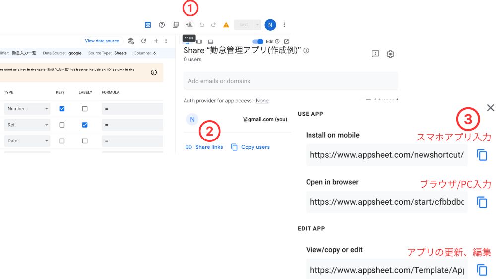 ①Appsheet作成画面で右上の「+👤」をクリック