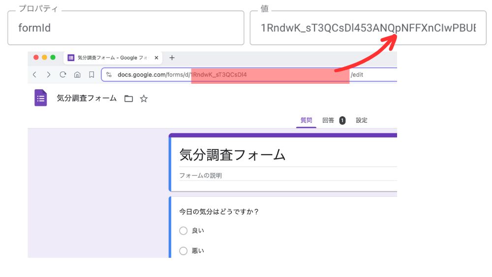 フォームのIDはGoogleフォームの設定画面に戻って、URLの’https://docs.google.com/forms/d/e/フォームID/viewform’ または ‘https://docs.google.com/forms/d/フォームID/edit’ となっているので、//の間の文字列を「formId」の値にコピペしましょう。