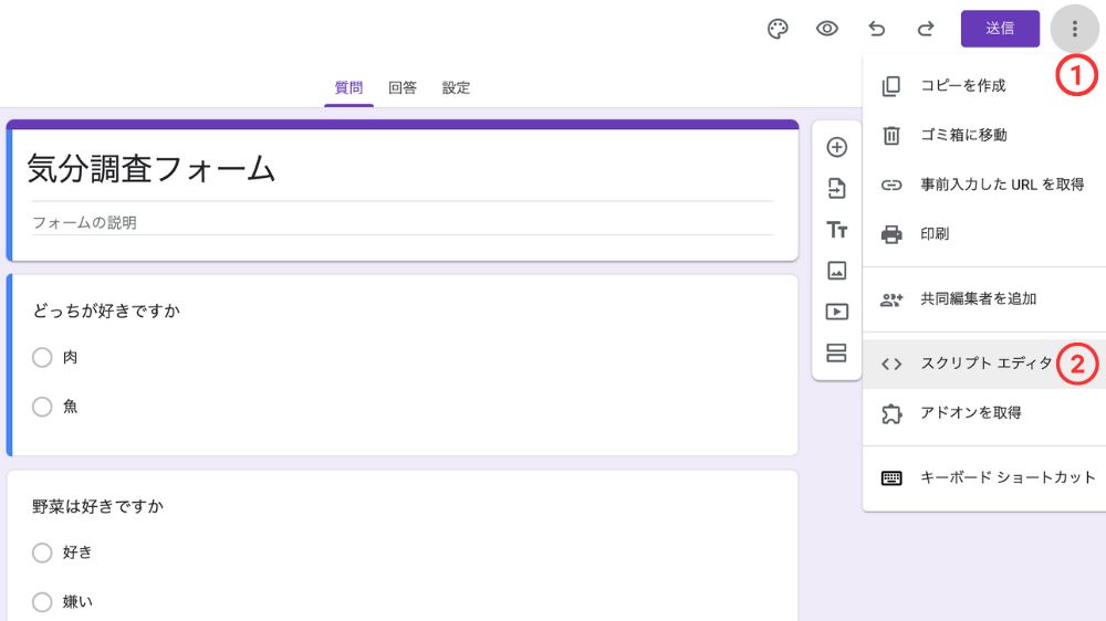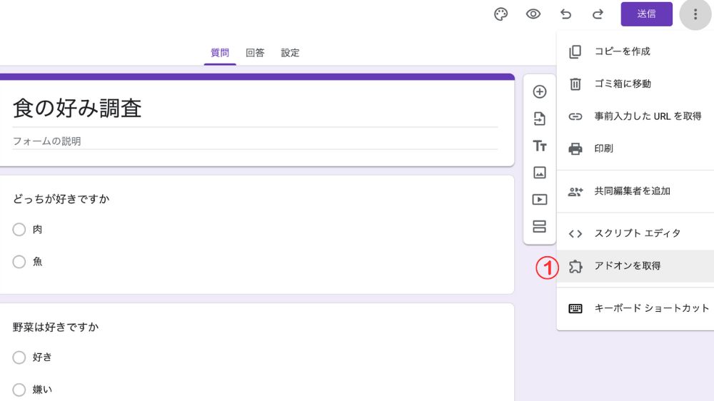 設定をしたいGoogleフォームの編集ページを開いた状態で