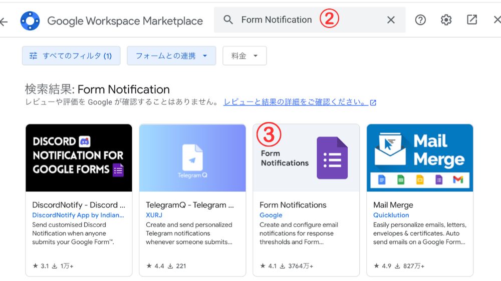 ①右上のパズルのピースマークをクリックして「Form Notification」をクリック