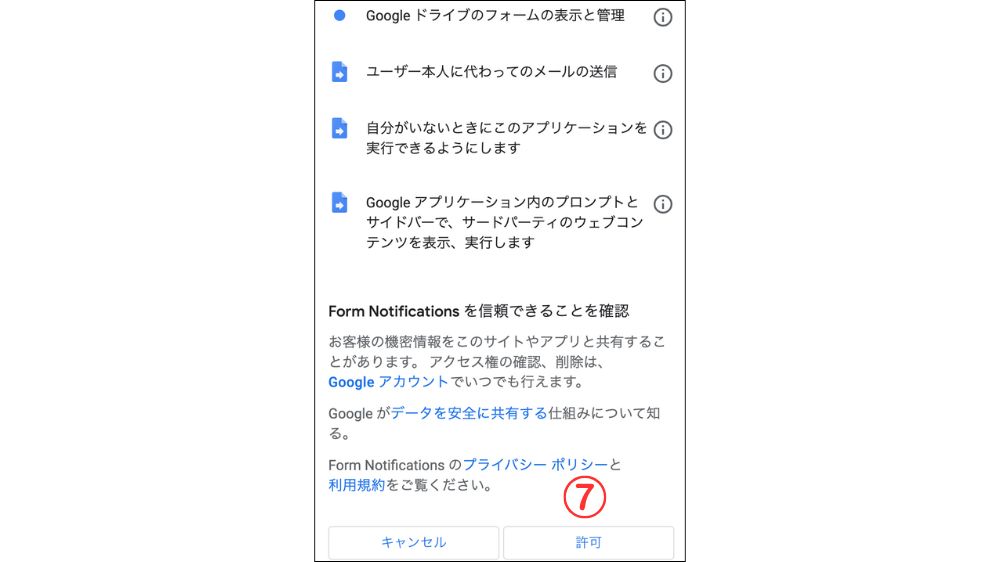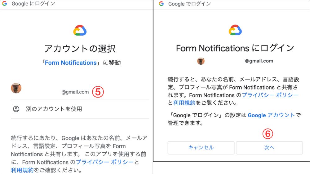 ⑤〜⑦ポップアップが出てくるのでアカウント選択、次へ、許可、と進める。