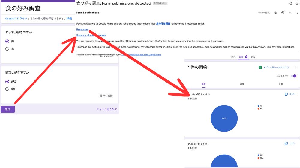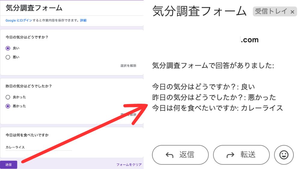 フォームで回答があると④で指定したアドレスに通知が送られます。