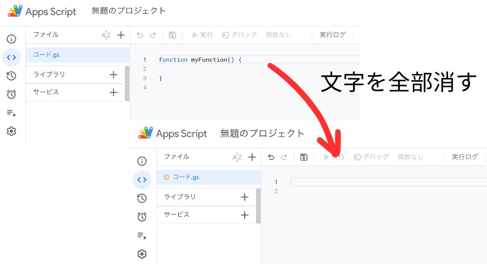 そうするとGASの画面が開きます。最初にfunction~~と書いてあるのを消します。