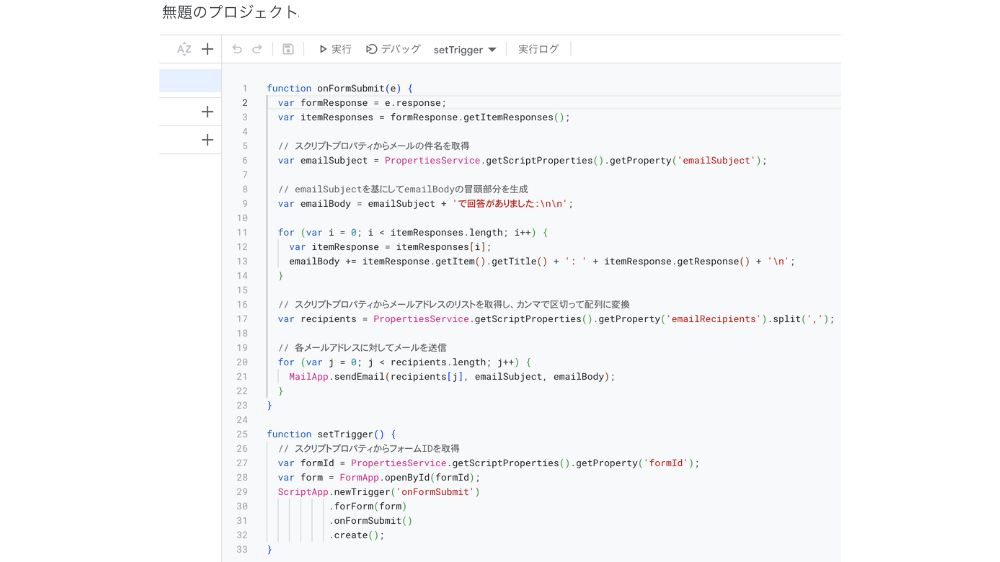 ここに複数のメールアドレスに通知を送る処理をするコードを書き込んでいきます。コードは以下をコピーして貼り付けでOK!