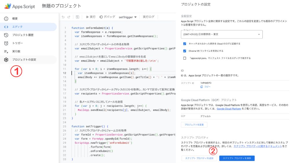 ①GASを開いた状態で左側にマウスを持っていくとメニューが出てくるので、「プロジェクトの設定」をクリック