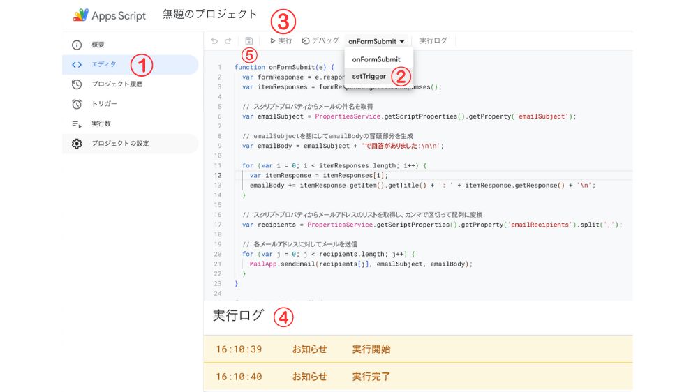 ②「onFormSubmit」と書いてある横の▼をクリックして、「setTrigger」をクリックします。